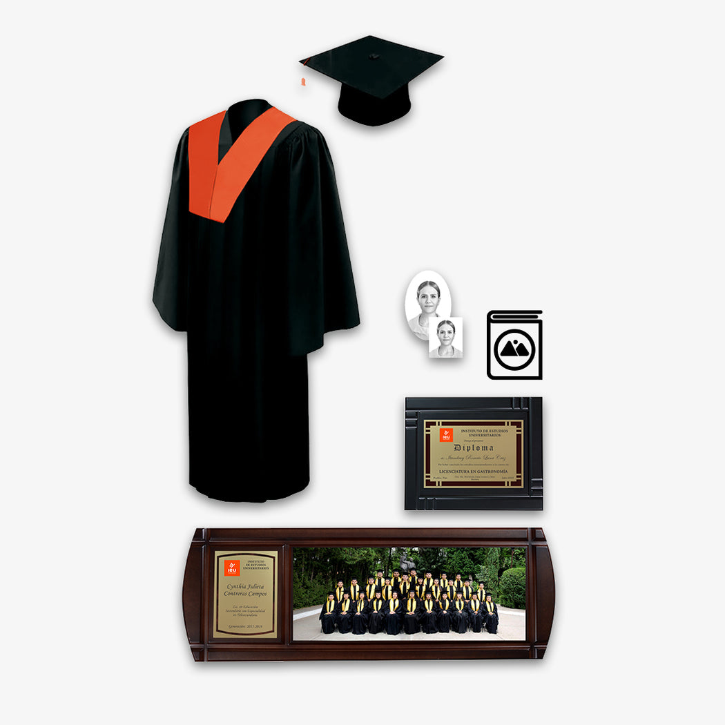 - Préstamo de toga color negro, con banda en color naranja y birrete.